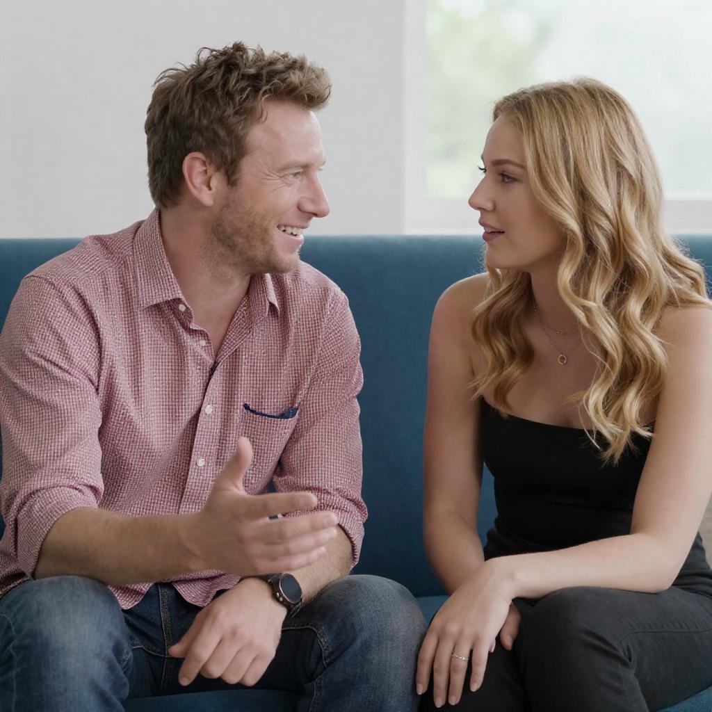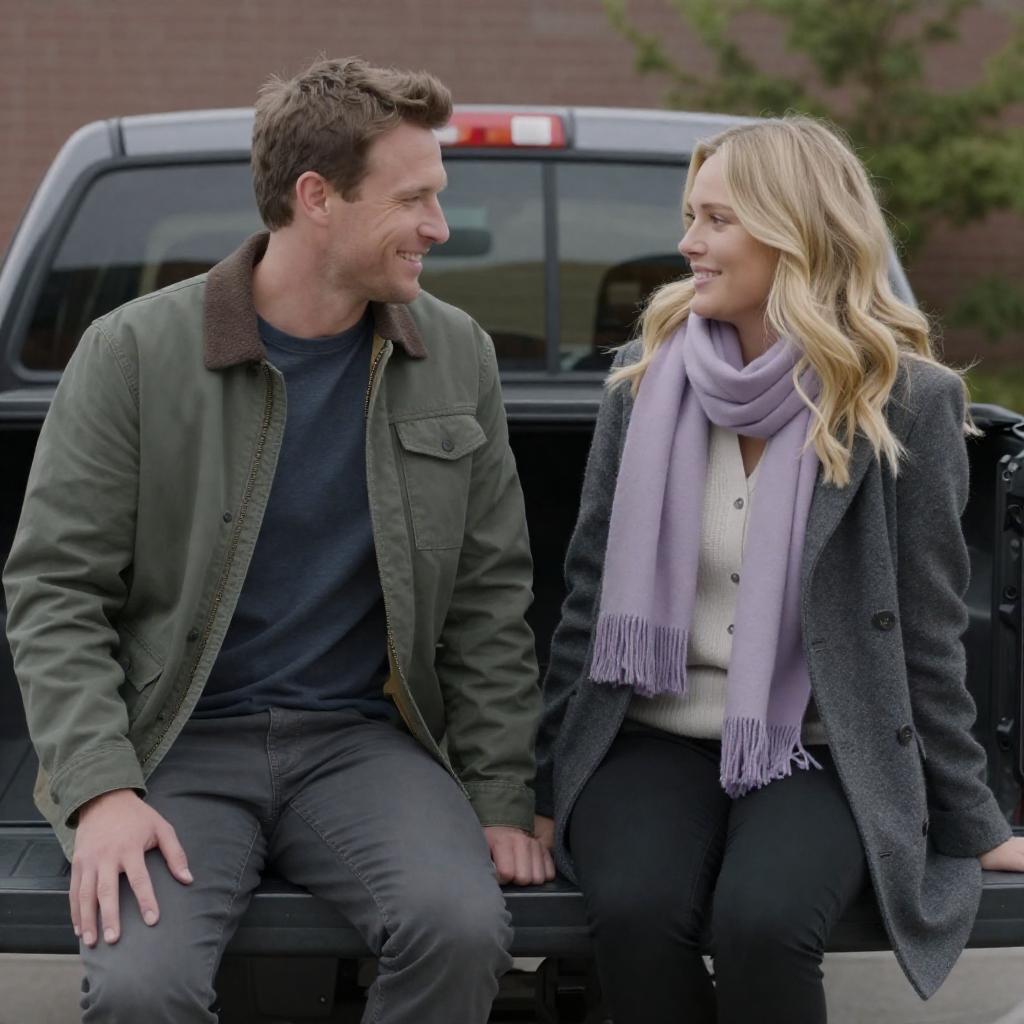 Photograph of a man and woman sitting on the edge of a black truck's tailgate. Man, with short brown hair and green jacket, leans slightly forward smiling. Woman, with blonde hair and gray coat with lavender scarf, smiles back. Background includes a blurred brick building and greenery. Man on left, woman on right. Both seated with hands resting on truck.