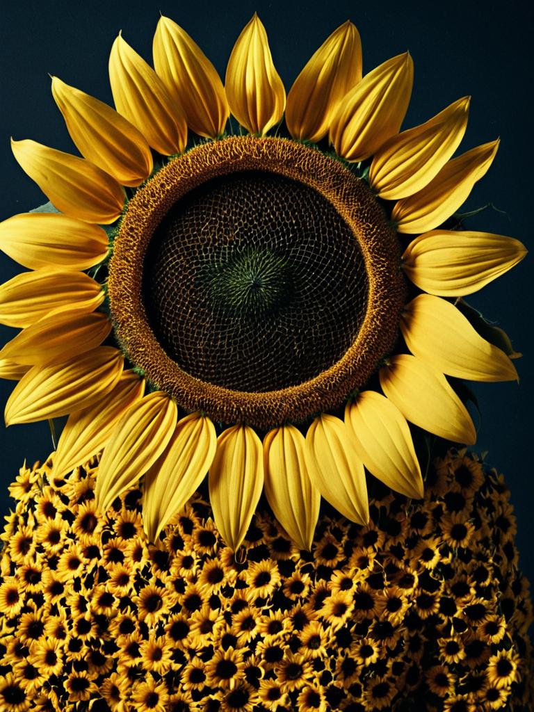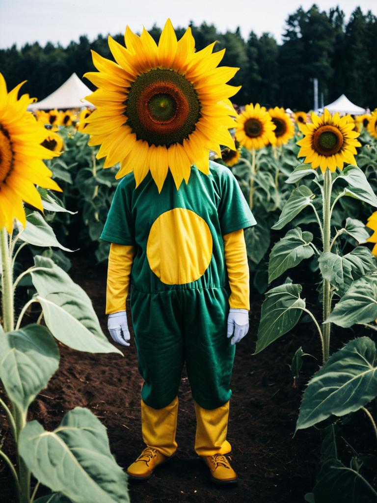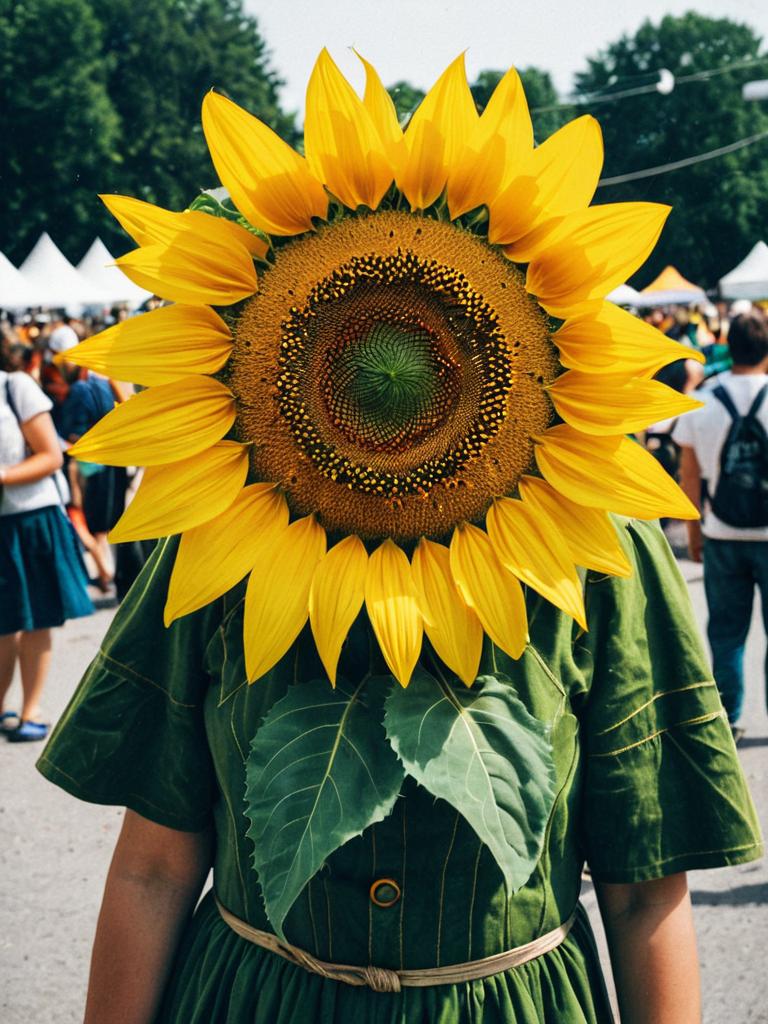 Person in Sunflower Costume, whimsical cosplay festival photo, photorealistic realism