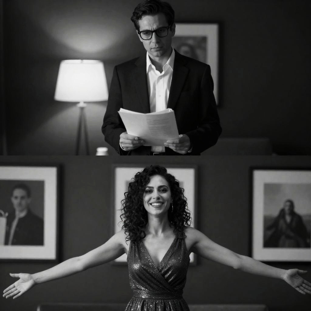 Black-and-white photograph of two people. Top: man with glasses, dark suit, white shirt, holding rolled-up papers, serious expression, standing in a dimly lit room with a lamp. Bottom: woman with curly hair, sparkling dress, smiling, arms extended, standing in a room with framed artwork and a dark background.