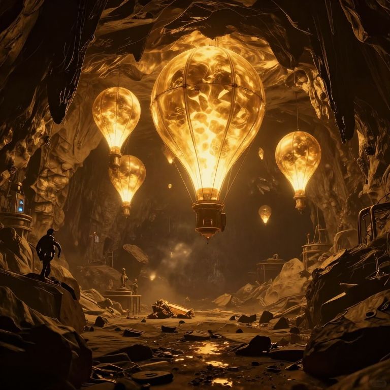 A cyberpunk-inspired 3D render depicts a surreal underground cavern illuminated by cascading geothermal balloons, their golden glow casting dramatic lighting on the rocky terrain below, creating a high-definition, otherworldly atmosphere.