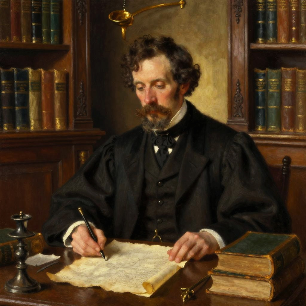Beadle in a Victorian-era library, wearing traditional scholar robes, surrounded by ancient books and parchment scrolls, warm golden lighting, intricate wood carvings, a sense of historical academia and quiet focus, oil painting style.