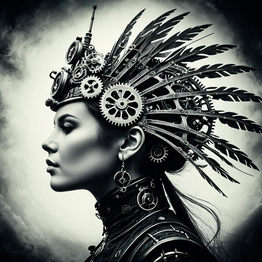 Monochrome profile portrait of a woman wearing an elaborate steampunk headpiece composed of gears and mechanical feathers. The headpiece features intricate metalwork with cogwheels and clockwork elements, paired with matching mechanical earrings and collar, capturing a futuristic Victorian aesthetic.