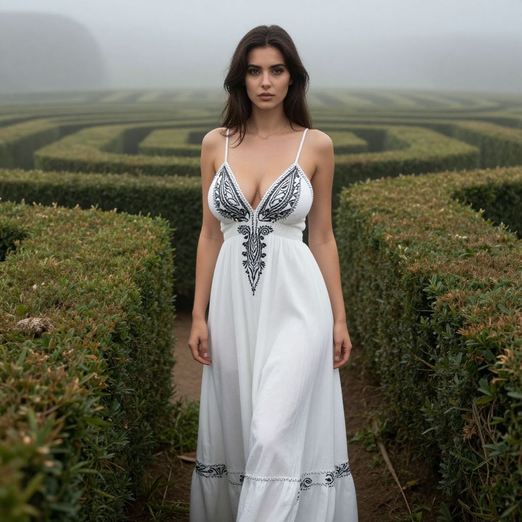 A slim woman, bohemian style, white maxi dress with tribal-inspired black embroidery on the bodice, deep V-neckline, thin spaghetti straps, flowing skirt, in a Wonderland labyrinth with living hedges. Foggy atmosphere, diffused light, mysterious feel Sexy. Pretty face and beаutiful eyes. Big breasts