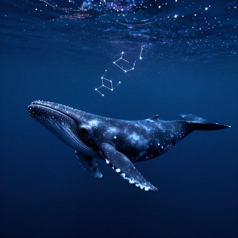 Silent whale glides gracefully through a starlit ocean, its body adorned with shimmering stardust, herding constellations with its serene song.