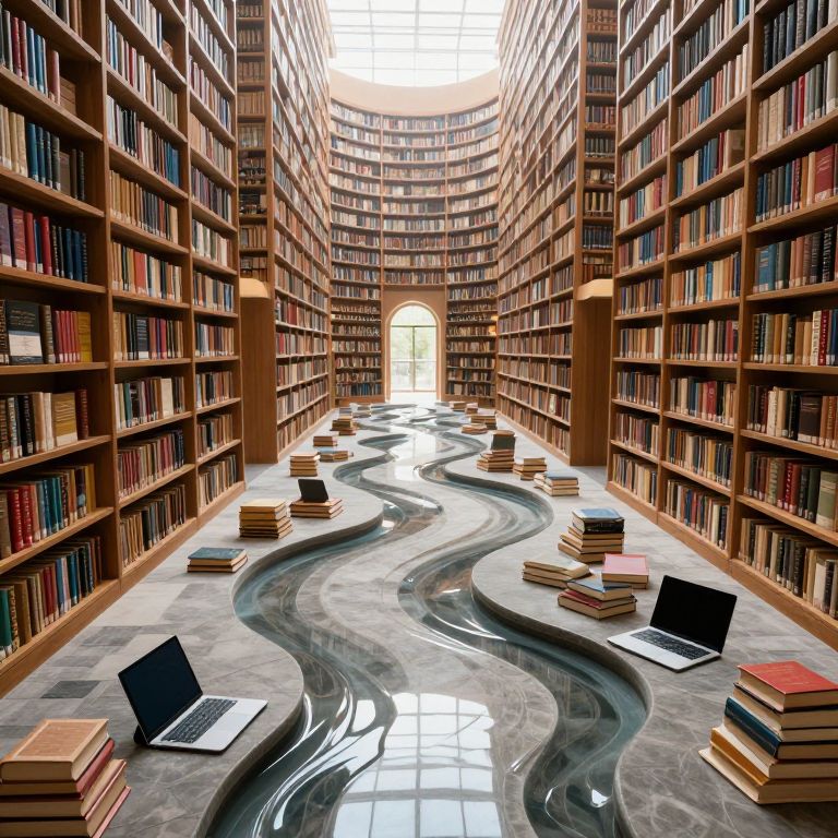 In a labyrinthine library where gravity defies expectation, stone pathways ripple like liquid pools, cradling scattered books and devices, while endless shelves of knowledge stretch into an ethereal, sunlit void.