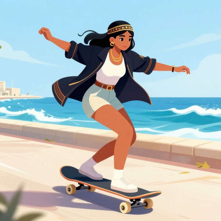 A dynamic scene of a modern Egyptian girl skateboarding along the Corniche in Alexandria, wearing urban streetwear inspired by Egyptian culture, ocean waves in the background, bright daylight, energetic and colorful illustration, semi-realistic style