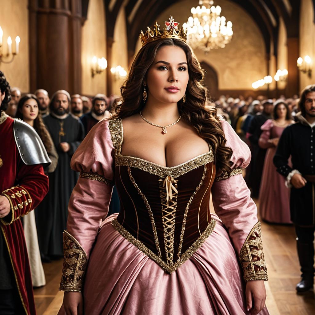 Realistic digital painting of a plus size queen with brown wavy hair wearing a gold crown and a pink medieval dress with lace-up front and puffed sleeves. She stands confidently in a crowded hall with warm lighting and blurred background figures, exuding a regal and elegant atmosphere with detailed rich fabric and realistic skin tones.
