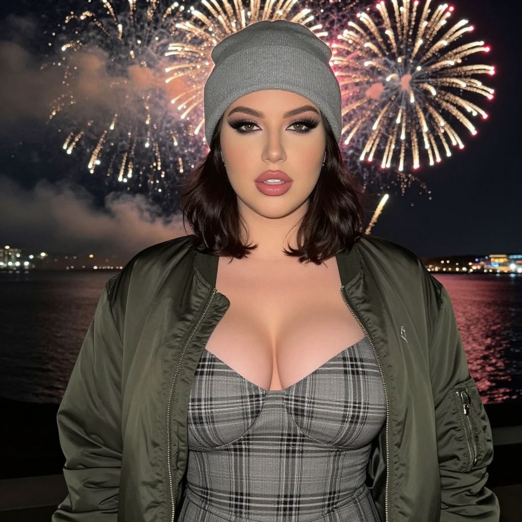 Photograph of a curvy woman with fair skin and dark brown hair, wearing a gray beanie, green bomber jacket, and a low-cut, plaid dress that highlights her ample cleavage. She has bold makeup with dark eyeliner and pink lipstick. Behind her, vibrant fireworks light up the night sky over a body of water. The scene is lively and festive.