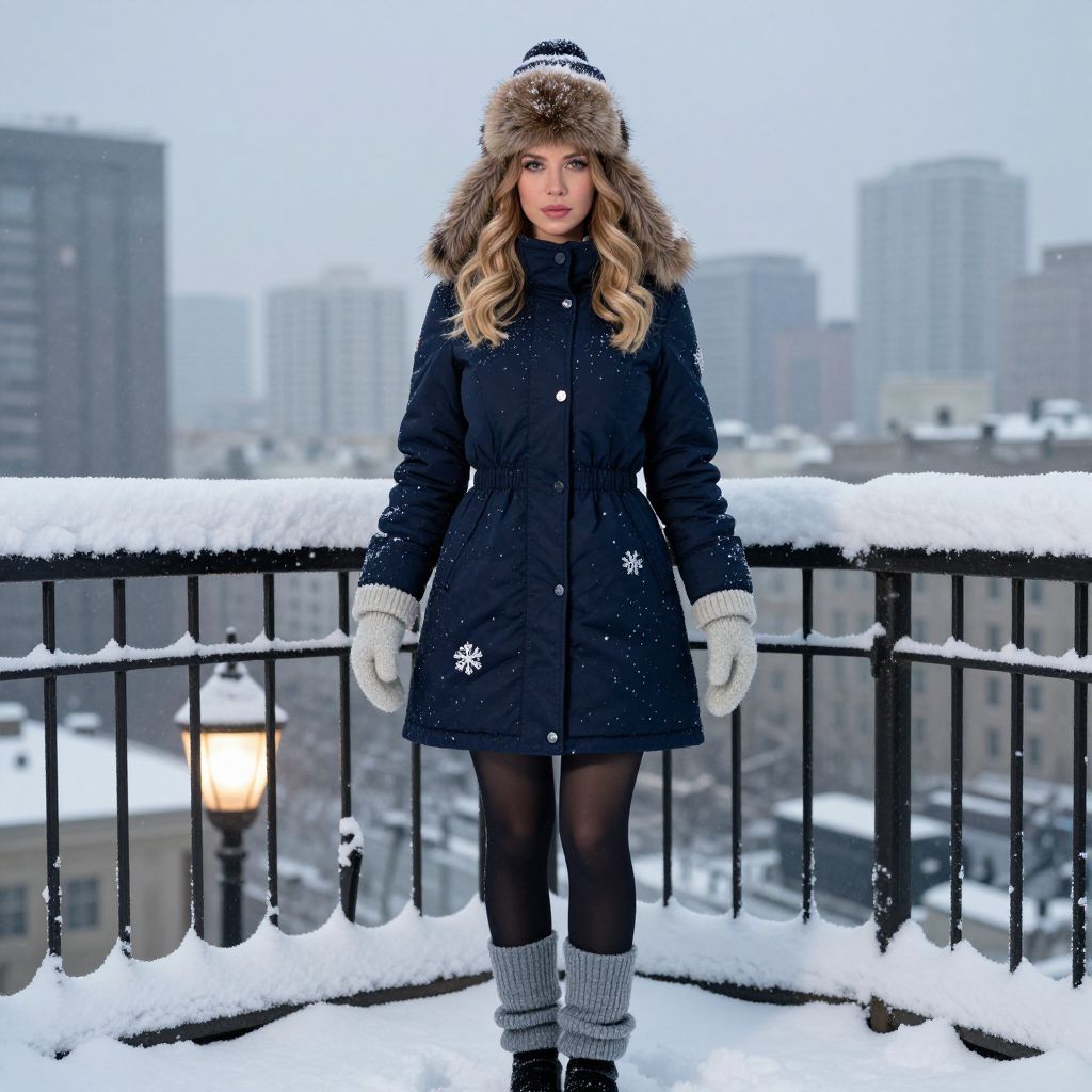 A realistic portrait of a woman in a winter snow costume posing on a snow-covered balcony with a city skyline in the background; she wears a dark navy snow coat with silver snowflake accents, black tights, and long wool socks, with a woolen mittens and a fur-lined beanie; she has fair complexion, wavy blonde hair, and a determined gaze; the snow is falling gently, and a warm streetlamp glows behind her, adding soft shadows to the scene.. The woman has big tits and cute face
