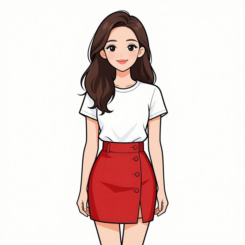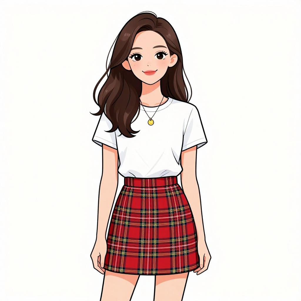 Woman with pretty face and pretty hair. smiling Woman, casual preppy, white crew neck t-shirt, short sleeves, tartan mini skirt in red, black, and yellow plaid, gold pendant necklace, plain white background. --sref 1467