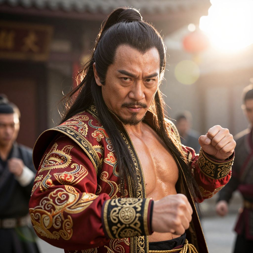 Photograph of a muscular Asian man with long black hair in an ornate red and gold traditional Chinese martial arts jacket, punching forward with intense expression in