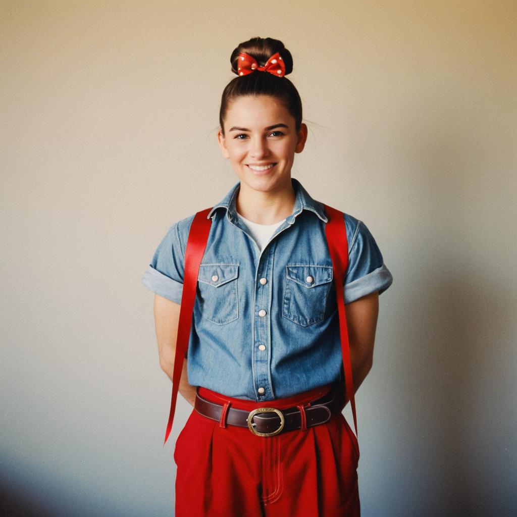 Portrait of a young man with brown hair styled in a single hair bun tied with a red polka dot ribbon. He is wearing a denim shirt with rolled-up sleeves, red pants, and a brown belt with an ornate buckle. The red ribbon suspenders complement his costume, which is inspired by an easy Disney character look. The subject is smiling and looking directly at the viewer, standing with his arms behind his back against a neutral background.