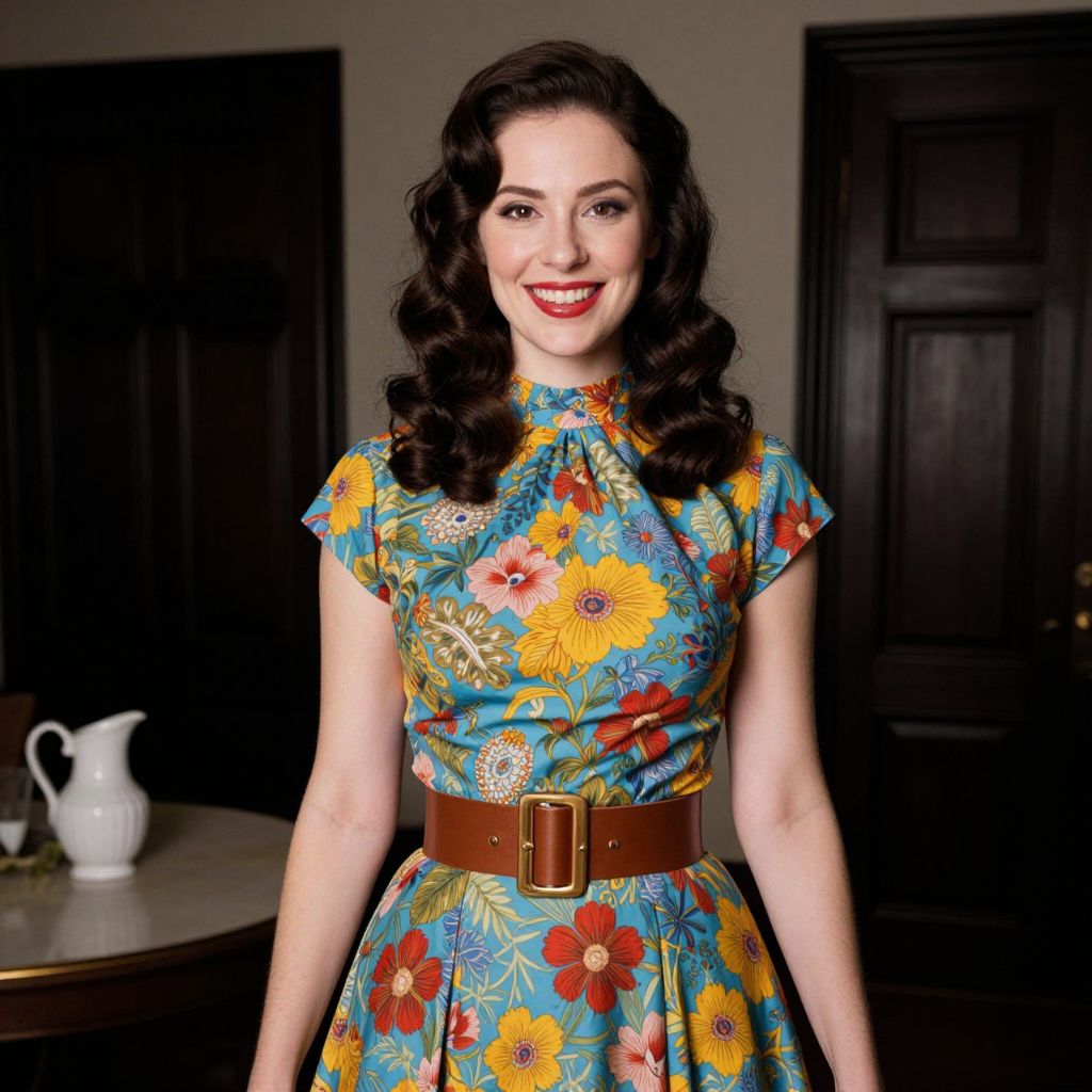 A photograph of a smiling woman with wavy, dark brown hair styled in soft curls. She's wearing a colorful, vintage-style dress with a high neckline and a wide brown belt. The dress features a floral pattern in blue, yellow, and red. She's standing in a dimly lit room with dark wooden doors and a white pitcher on a table in the background.
