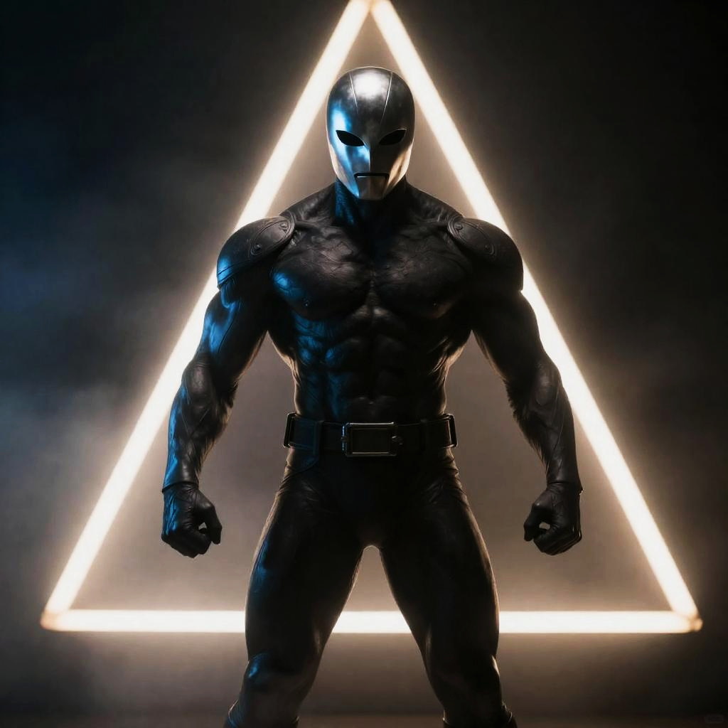 Muscular, armored humanoid with a silver, featureless mask stands in a misty, triangular, illuminated frame. Dark, shadowed body, defined muscles, clenched fists. Blue light on the left, warm light on the right. Dark background, intense, imposing presence.