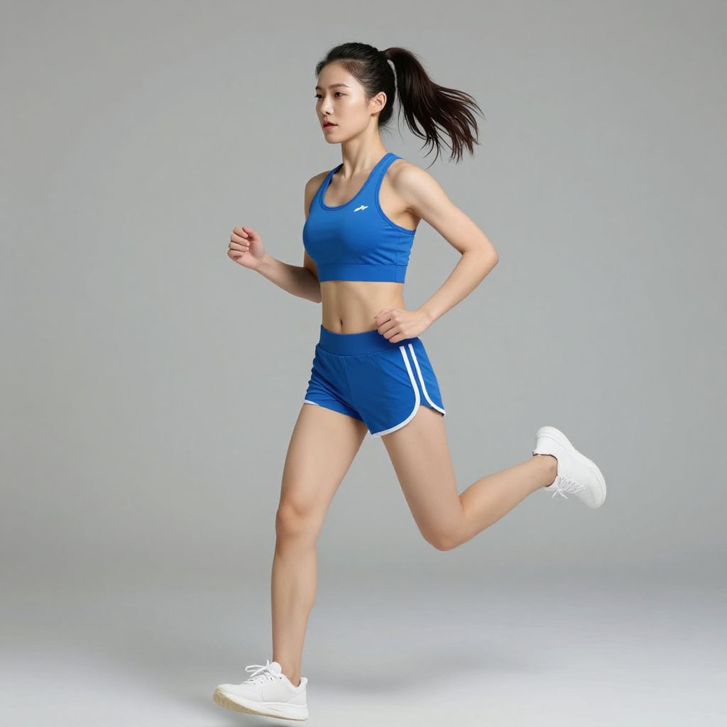 Running Shorts Woman Costume, woman in a blue sports bra top and shorts
