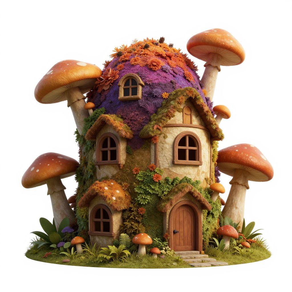 Whimsical fairy-tale cottage with a purple dome, surrounded by oversized mushrooms, vines, and colorful flowers, featuring arched windows and a wooden