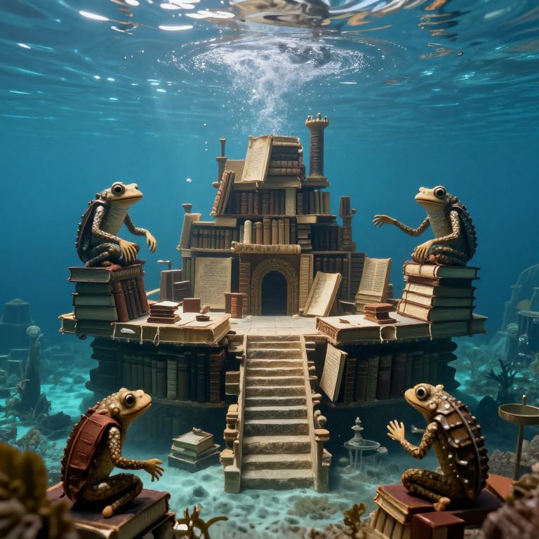 An underwater palace constructed entirely from ancient books is inhabited by amphibious philosophers who debate above and below water.