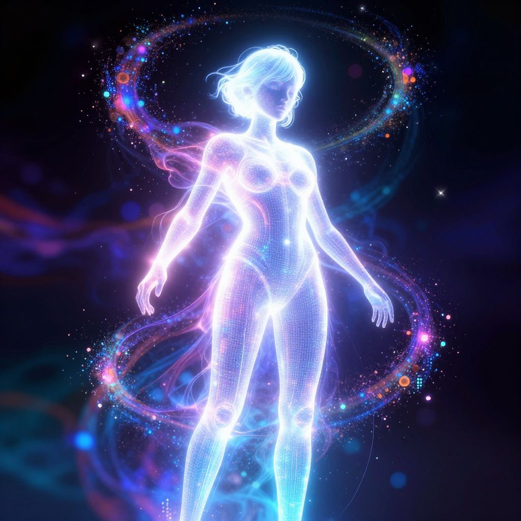 A digitally rendered image of a transparent, glowing blue woman floating in dark blue ocean water. Her wet hair fans out around her head, and her arms are extended slightly forward. She wears a translucent bikini, revealing her slender physique and small breasts. Bright blue light emanates from her body, creating a luminous effect that contrasts with the dark water. Ripples surround her, and the overall scene is illuminated with a cool blue hue, emphasizing the ethereal, otherworldly quality of the image.