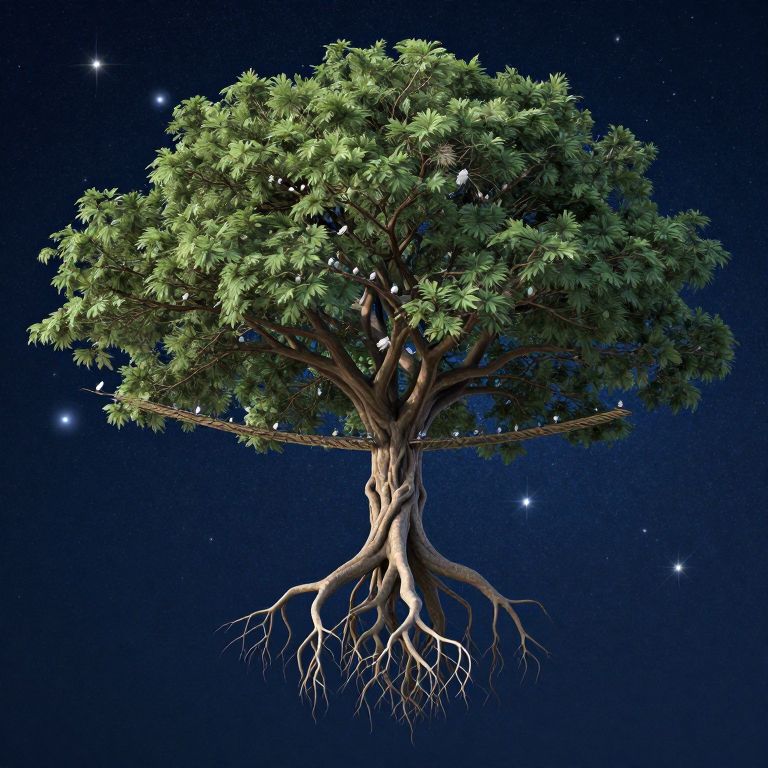 A giant tree with floating branches acts as a skyway for birds that never touch the earth, while its roots stretch into the stars.