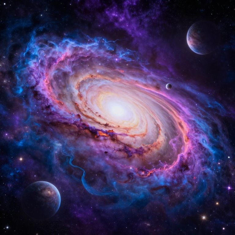Comsic scene depicting a vibrant galaxy with swirling colorful nebulas, sparkling stars, and distant planets under a deep purple and blue cosmic sky, high detail, futuristic space art style, vivid and luminous.