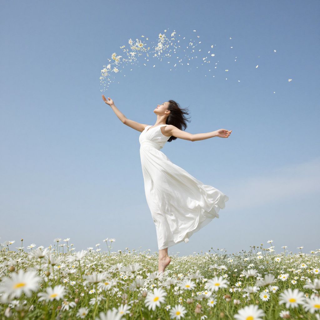 A woman in a flowing white dress gracefully floats above a field of daisies, her outstretched arms guiding a cascade of petals that drift like a living, ethereal cloud against a serene blue sky.