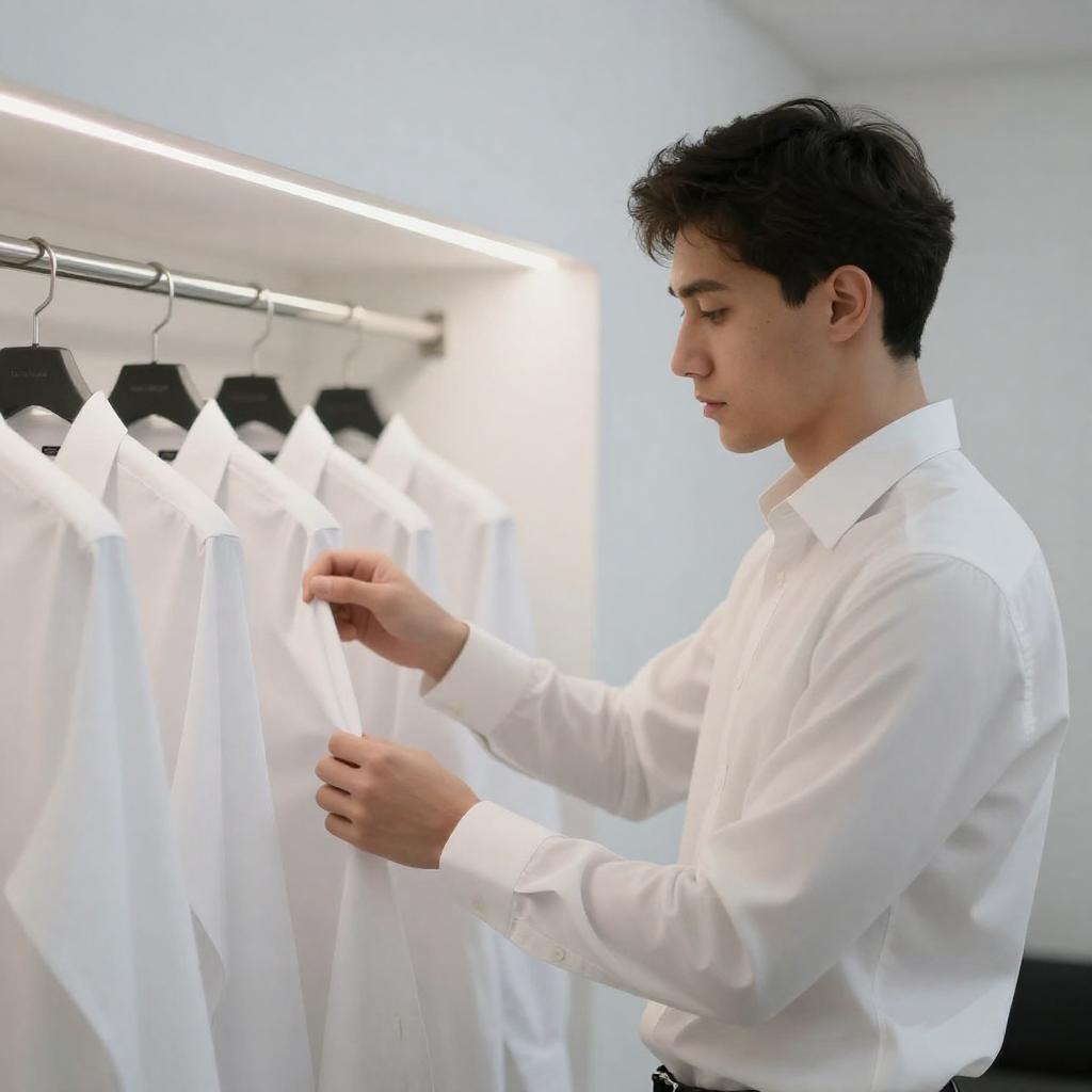 Photograph of a young man with short dark hair, wearing a white dress shirt, standing in front of a brightly lit clothing rack. The rack holds several white, neatly hung shirts. The man's expression is neutral, and he is adjusting his shirt. The background is a minimalist, white-walled room.
