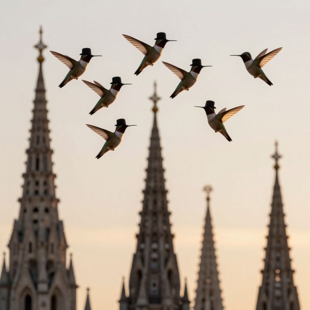 Five elegant hummingbirds, each donning tiny black top hats, gracefully hover and flutter in unison above the majestic spires of a grand cathedral, creating a surreal and whimsical aerial spectacle against the soft glow of a golden sunset.