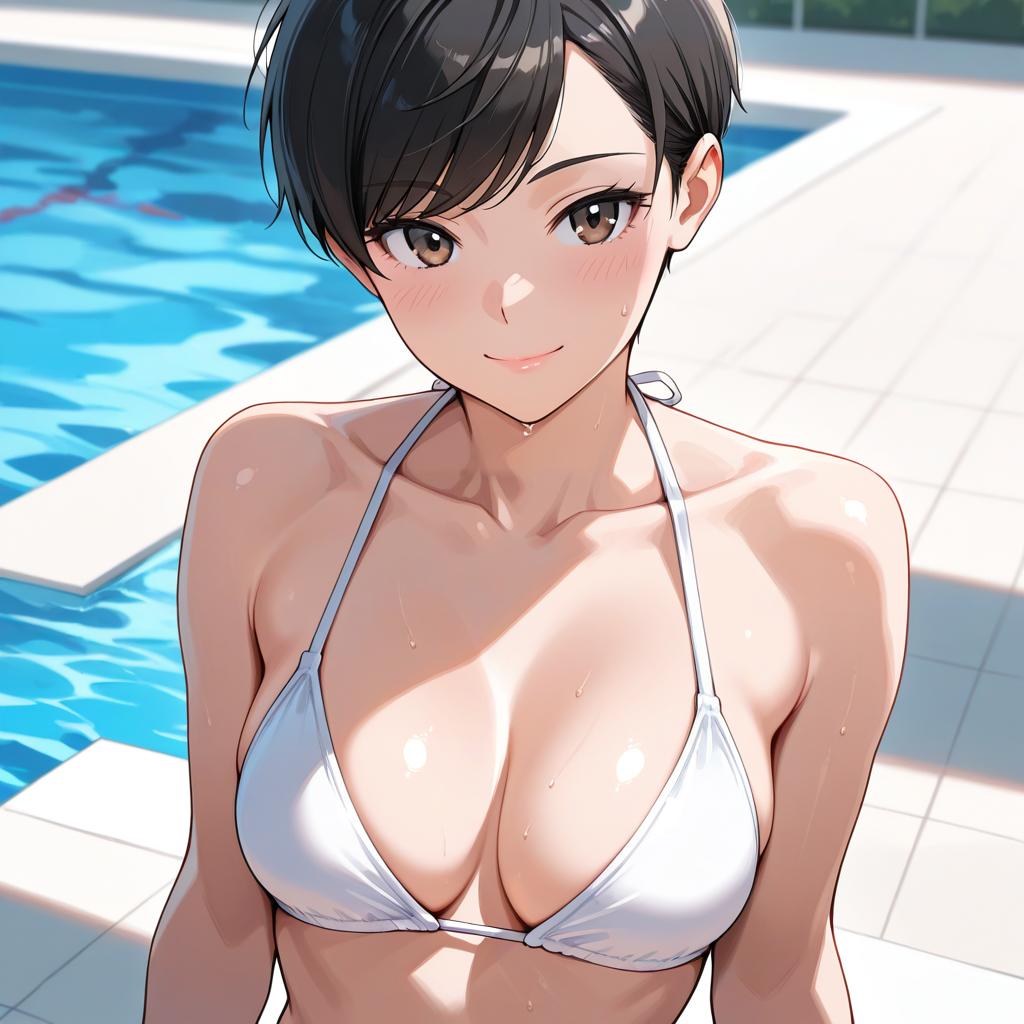 Illustration of a young woman with short black hair and swept bangs, wearing a white bikini standing by the poolside. She has medium-sized breasts, light skin with water droplets on her body, and is smiling while looking at the viewer. The background features a blue swimming pool and tiled pool deck.