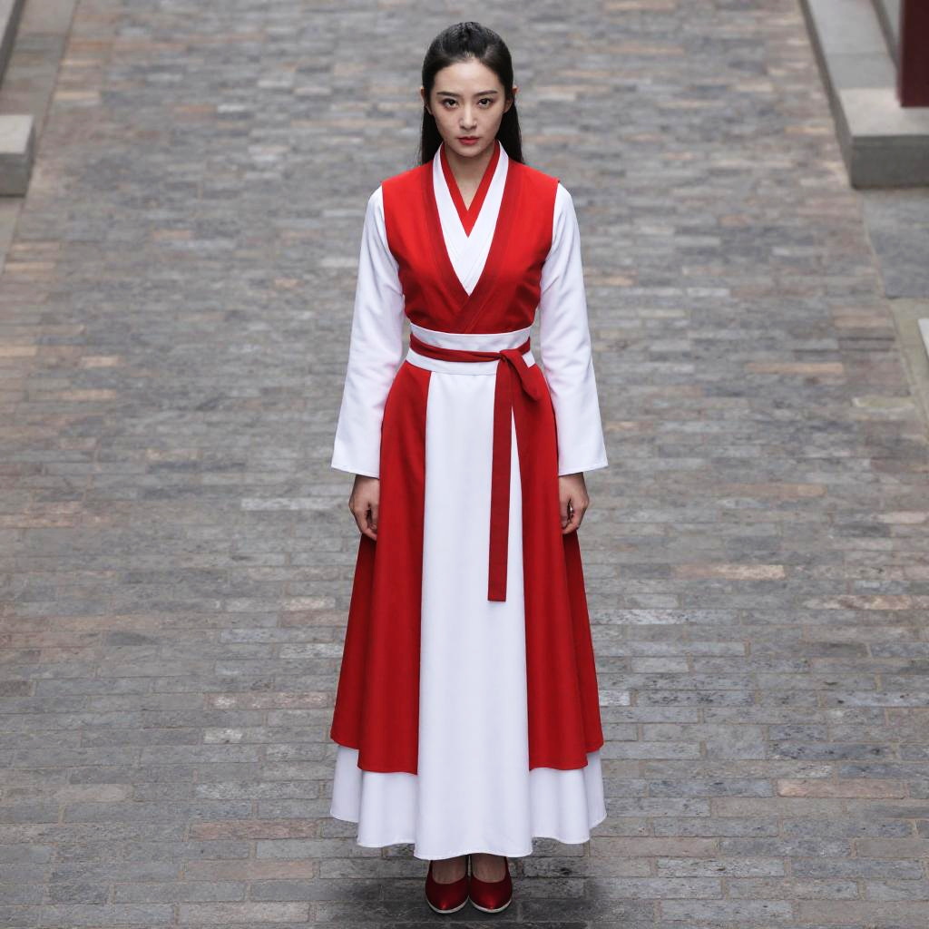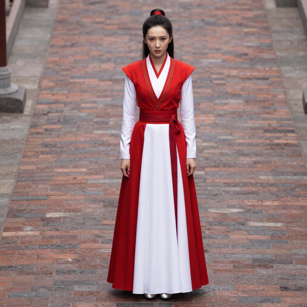 Shang Chi Woman Xialing Costume, a woman in a red and white dress standing on a brick walkway