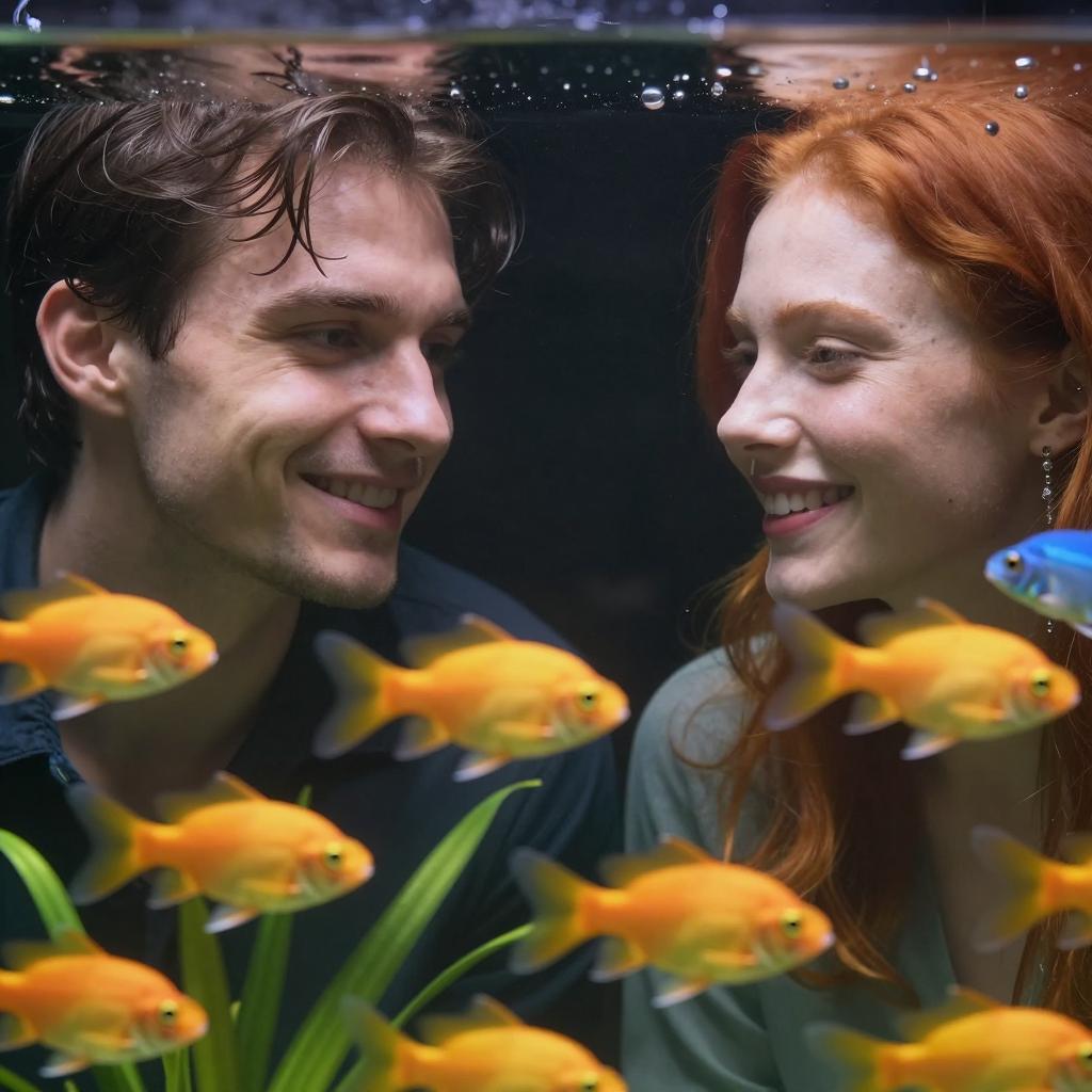 Photograph of two people in a fish tank. Woman with red hair on the right, smiling, looking at man with wet hair on the left. Reflections of man's face in the glass. Bright yellow fish in foreground, orange and blue fish in background. Aquarium tank with plants and bubbles. Man's face partially obscured by reflection and fish.