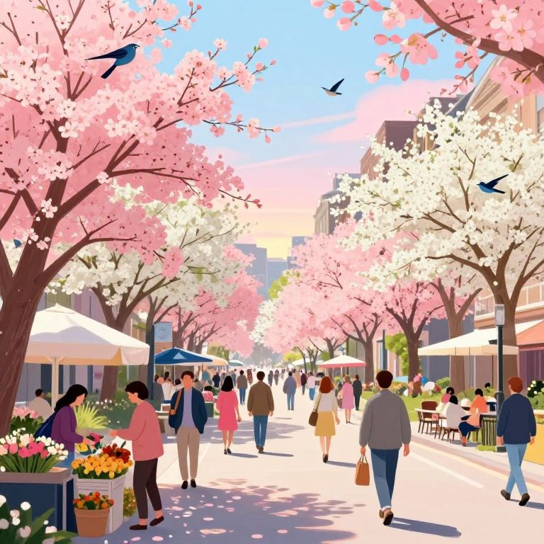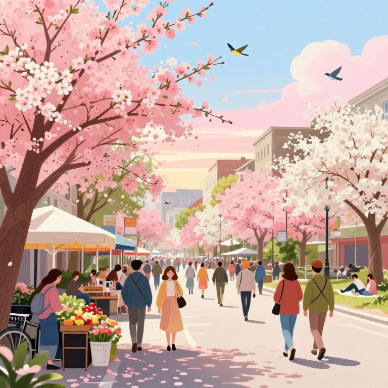 The illustration captures a bustling city street in the midst of springtime, with trees lining the street in full bloom, their branches adorned with vibrant pink and white blossoms. People are seen walking up and down the street, taking in the sights and sounds of the season, many dressed in lighter clothing, shedding their winter coats for colorful spring jackets and dresses. Some might be carrying umbrellas or raincoats, reflecting the unpredictable weather that often accompanies the transition to spring. In the foreground, a street vendor might be selling flowers or fresh produce, taking advantage of the bountiful crops that come with the season. The scent of spring blossoms and fresh fruits and vegetables fills the air, adding to the sensory experience of the scene. In the background, the street is filled with other signs of springtime, such as outdoor cafes with patrons enjoying the warm weather, public parks with people lounging on blankets, and festivals or events that celebrate the season. The sky might be a bright blue or a soft shade of pink or orange, reflecting the beauty of the sunrise or sunset. Birds can be seen fluttering around the trees, chirping and singing their springtime melodies. Overall, the illustration captures the vibrant and energetic spirit of springtime in the city, with people and nature coming to life after the long winter months. It is a celebration of renewal, growth, and the beauty of the natural world, and an invitation for viewers to step outside and experience the magic of the season for themselves.