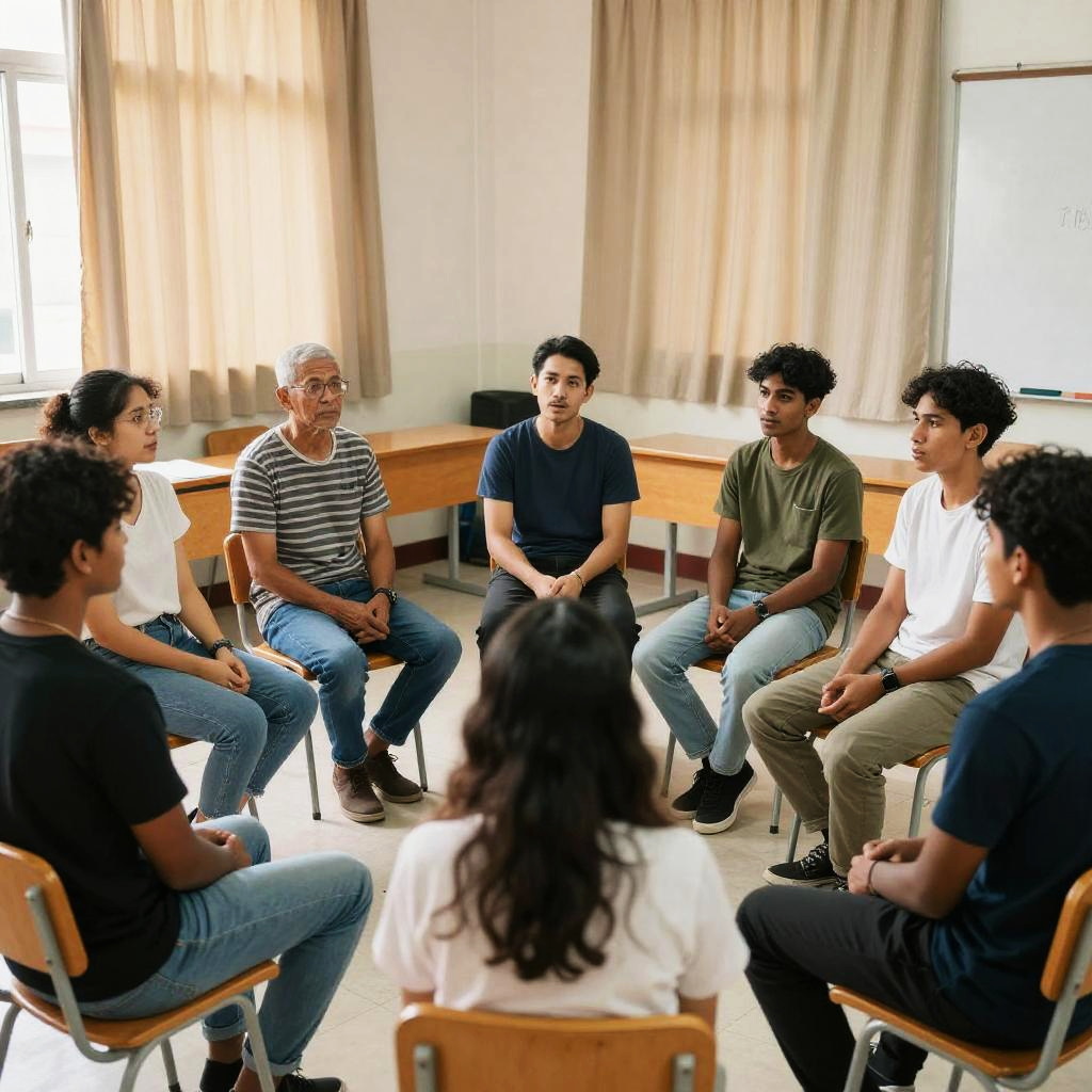 A diverse group of people engaged in a serious discussion seated in a circle inside a bright classroom. The group includes young adults and an older man, all dressed casually, seated on wooden chairs. The room features beige curtains and wooden desks with natural light streaming through a window.