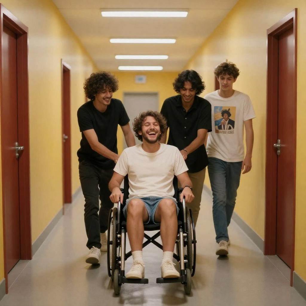 Photograph of four men in a hallway. A man in a white t-shirt and shorts sits in a wheelchair, laughing. Three men with curly hair, one in a black shirt and pants, another in a black shirt and jeans, and the third in a white shirt with a graphic, push him. The hallway has yellow walls, red doors, and fluorescent lighting.