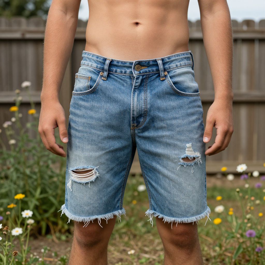A young adult with a warm, casual smile and slightly roughened skin tone stands in a sun-drenched backyard, wearing distressed shorts that have faded blue denim with visible tears and patchwork repair seams, the fabric frayed at the hem and thighs, contrasting against a background of wildflowers and a wooden fence.