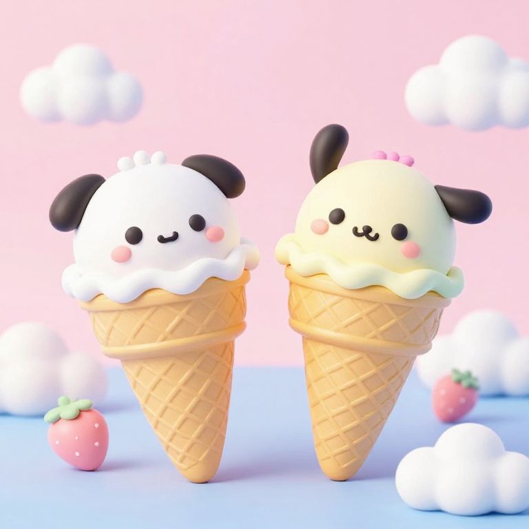 Kawaii ice cream cones come to life with cheerful faces, whimsical accessories, and fluffy clouds beneath them, creating a dreamy, surreal scene of sweet companionship.