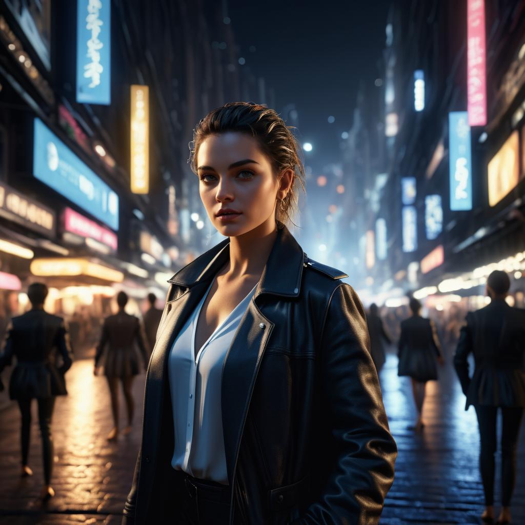 Portrait of a confident young woman wearing a black leather coat standing on a wet city street at night. The urban background is illuminated with bright neon signs and blurred silhouettes of people walking, creating a lively metropolitan atmosphere.