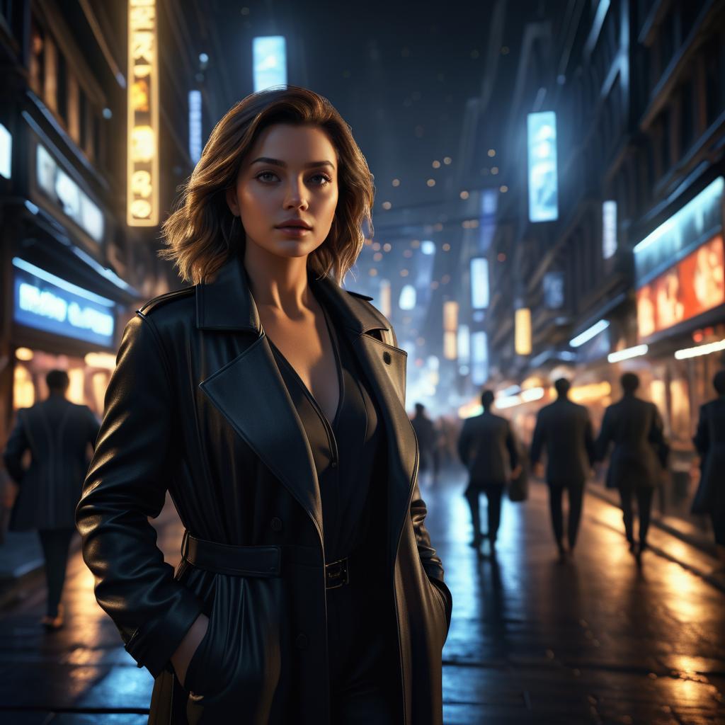 Woman in Black Leather Coat on City Street at Night