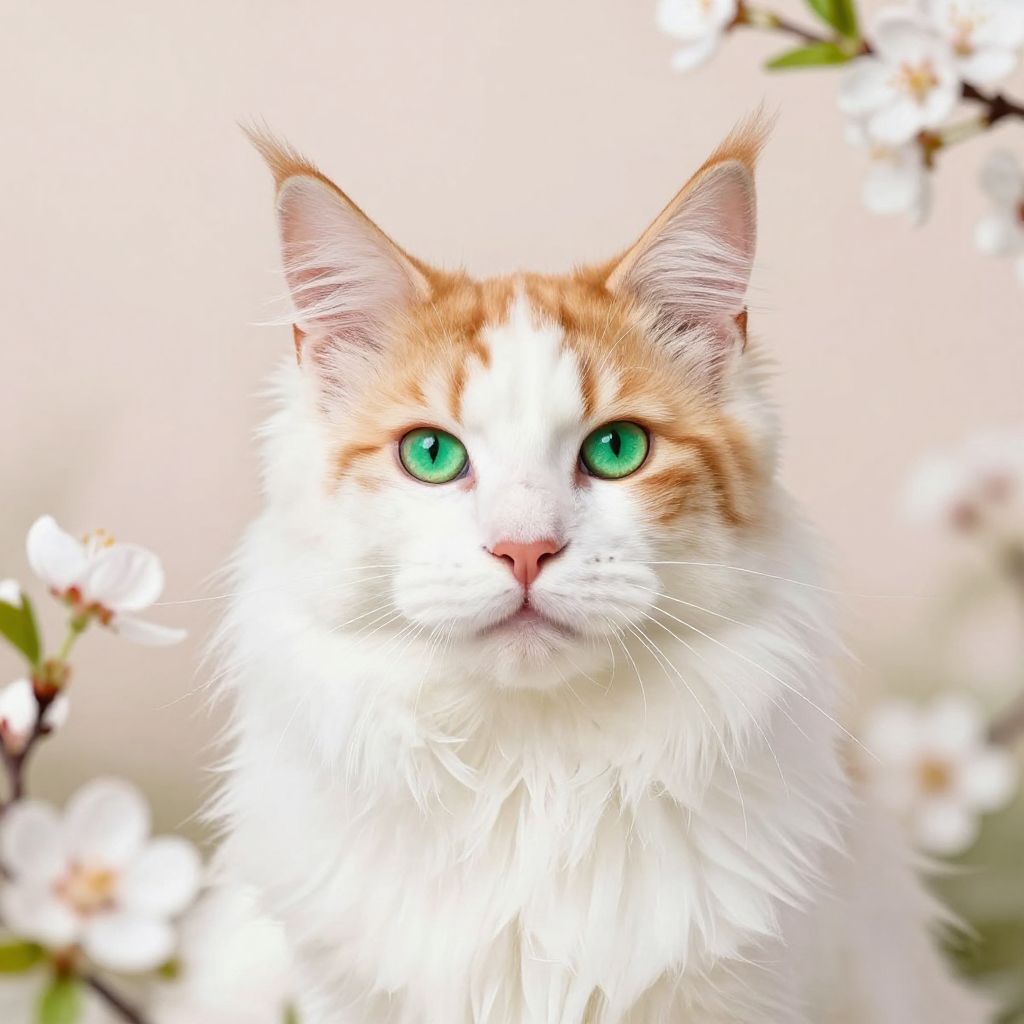 Maine coon white and orange cat with bright green eyes, surrounded by blooming spring flowers, soft pastel background, whimsical and artistic style with realistic fur patterns