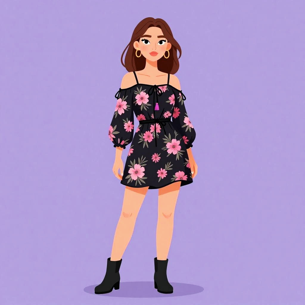 Woman with pretty face and pretty hair. smiling Woman, bohemian, oversized black knit poncho with cowl neck, patterned border around the hem featuring pink and purple geometric designs, fringe detailing along the hem, fitted black leggings. --sref 1467