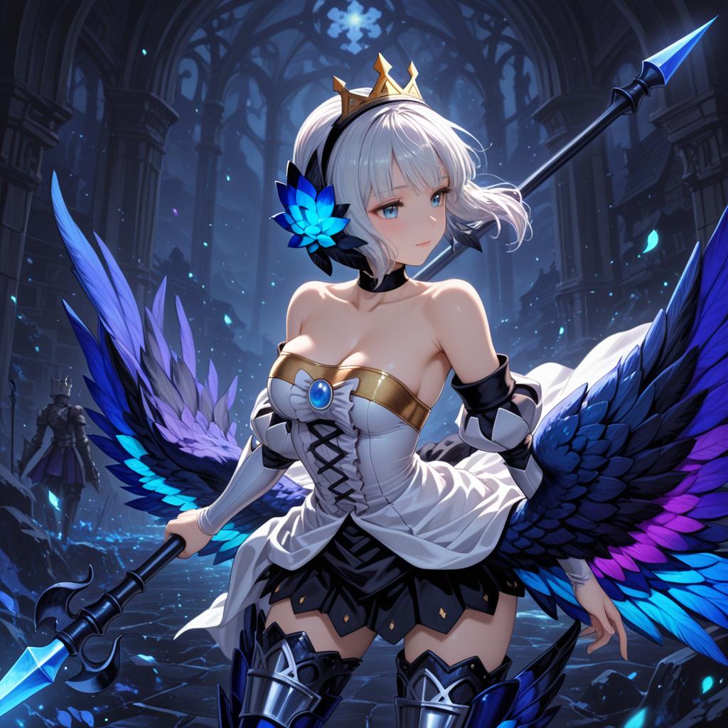 Digital fantasy artwork of a female warrior with short white hair, blue eyes, wearing a strapless armored dress with black thigh highs and detached sleeves. She has a black choker and a golden crown, holding a blue spear. The character has large multicolored wings in shades of blue and purple, set in a dark, gothic cathedral background with a knight figure in the distance.