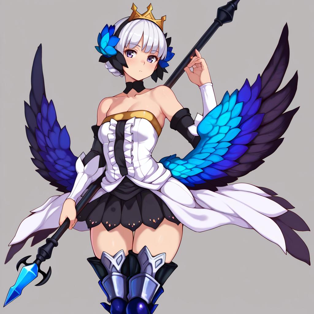 Gwendolyn (odin sphere), odin sphere, 1girl, blue eyes, purple eyes, white hair, short hair, grey hair, strapless dress, armored dress, thighhighs, bare shoulders, detached sleeves, choker, multicolored wings, low wings, multiple wings, spear, crown, by artist ishii hisao, dark_illustrious