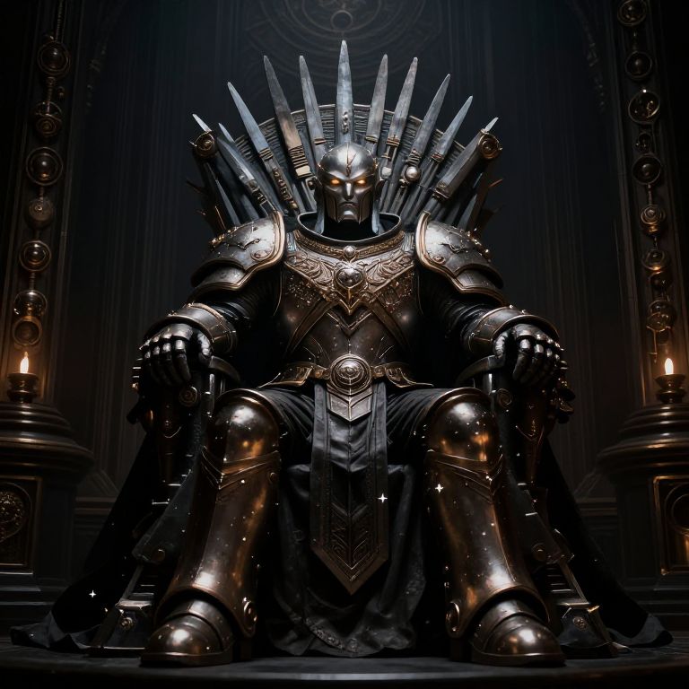 Digital art of a dark, armored, robotic king with spiked crown, seated on a grand throne in a dimly lit, gothic chamber.