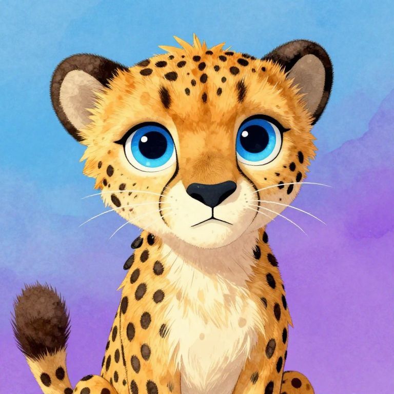 Cute, cartoon-style digital drawing of a wide-eyed, blue-eyed cheetah with fluffy fur and black spots against a gradient blue-purple background.
