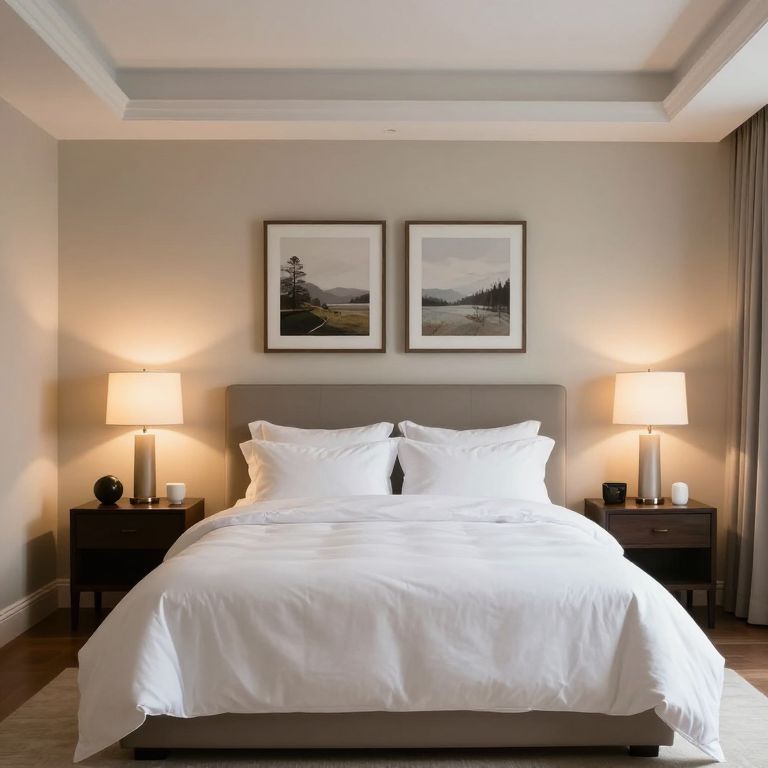 Luxuriously appointed bedroom featuring a king-size bed with plush white bedding, flanked by two matching bedside tables each holding a lit lamp and decorative items, complemented by a pair of framed landscape artworks above and soft ambient lighting from recessed ceiling fixtures.