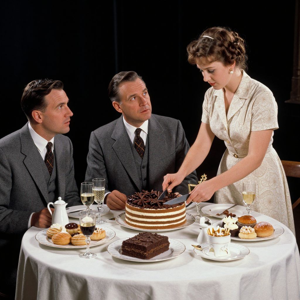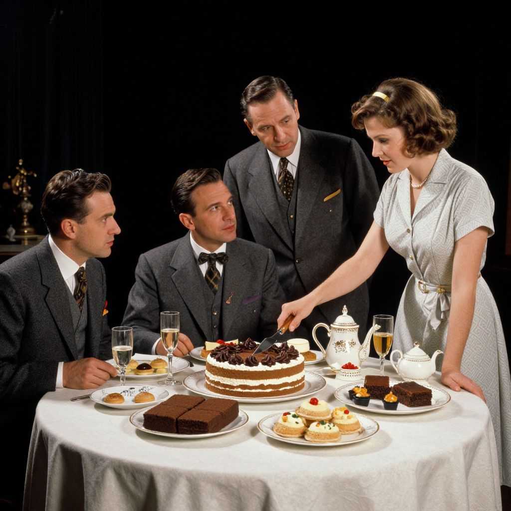 Vintage scene depicts three figures gathered around a round table laden with an array of desserts, including a layered cake topped with chocolate, a rectangular brownie, and assorted pastries, while two men in suits observe as a woman in a light dress slices the cake, all set against a dark backdrop with subtle details of wine glasses, teapots, and decorative elements.