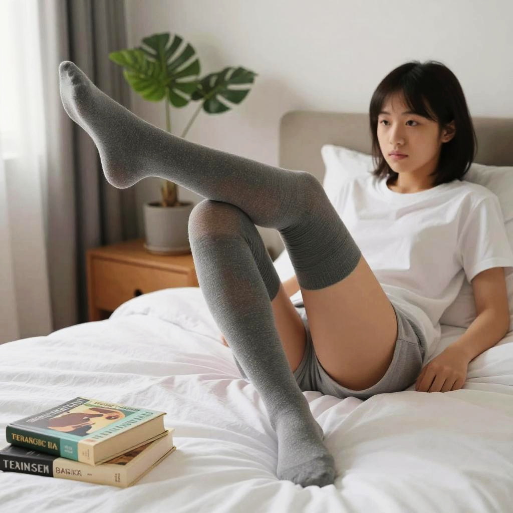 Teen in thigh highs lounging in a modern bedroom with books and plants, soft natural daylight, relaxed and intimate setting, detailed fabric textures and calm color tones