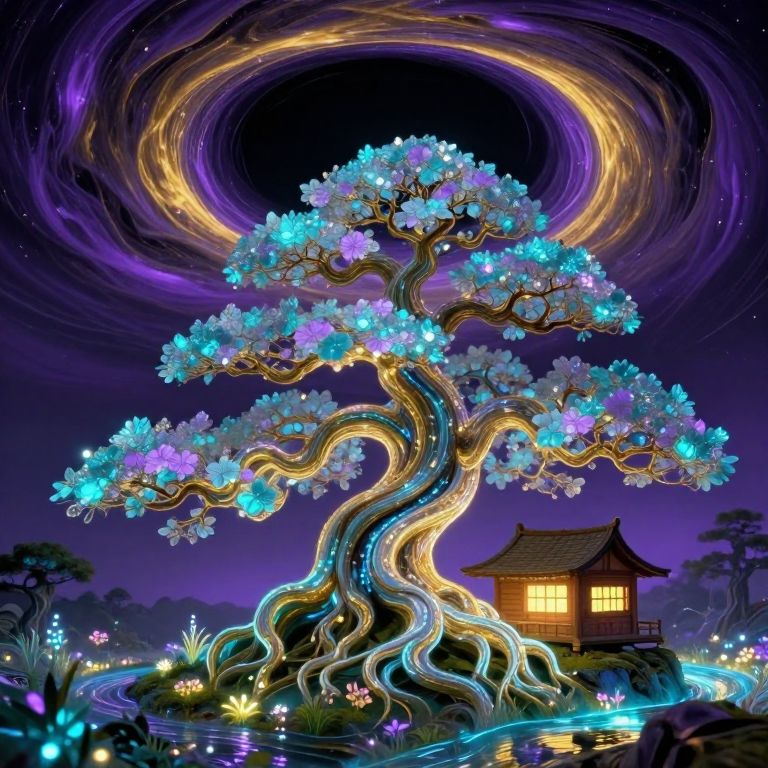 A breathtaking, hyper-detailed masterpiece, depicting a luminous bonsai tree of colossal proportions, its intricate branches twisting and curling in random, surreal patterns, The tree glows softly with ethereal hues of turquoise, lavender, and gold, its luminous leaves shimmering like delicate gemstones, Beneath its sprawling canopy, the roots curve and intertwine, forming a labyrinthine structure that glows faintly, as if imbued with the life force of the land itself, Above, a massive black hole looms in the vibrant sky, its edges swirling with vivid streaks of violet and deep gold, pulling in fragments of light and casting an eerie, otherworldly glow over the scene, The black hole’s gravitational pull subtly distorts the atmosphere, creating rippling, dreamlike waves of light and shadow across the luminous landscape, Nestled beside the towering bonsai tree is a small, rustic house with a curved roof, glowing windows, and an inviting, warm light emanating from within, The house's simplicity contrasts beautifully with the fantastical surroundings, its wooden walls blending naturally into the luminous land, The ground is covered in radiant grass and flowers that emit a soft bioluminescent glow, while streams of liquid light meander across the terrain, creating an otherworldly, enchanted ambiance