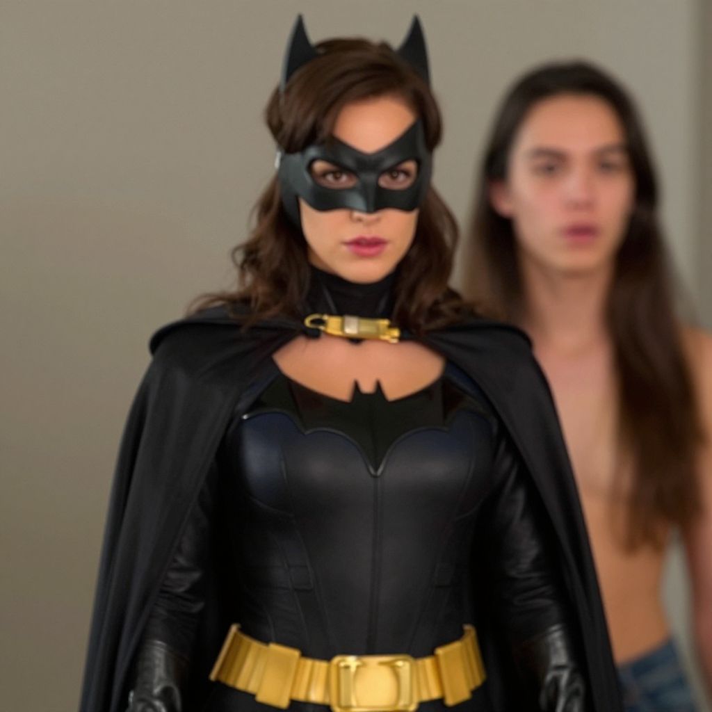"bombshell batgirl costume, 1girl, cape, solo, mask, boots, gloves, bodysuit, superhero, belt, black cape, full body, looking at viewer, breasts, standing, lips Realistic photo of casual sexy person with pretty face"