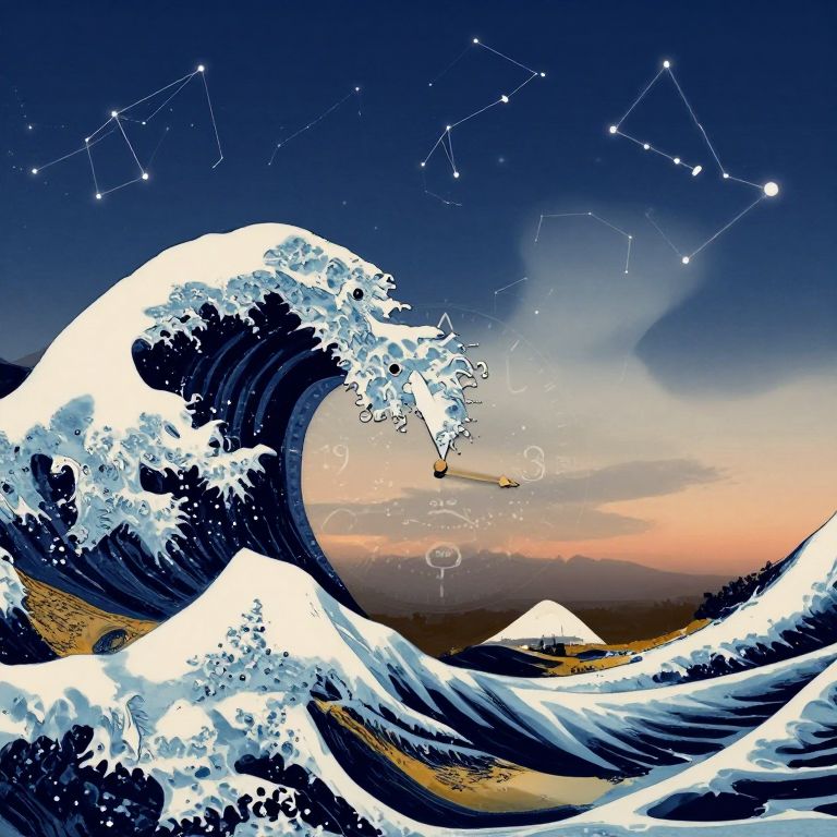 Craft an image reminiscent of Hokusai's iconic wave, blending it with surreal elements akin to Magritte. The scene portrays a colossal clock face rising from the crest of a massive wave, its hands frozen at an enigmatic hour. Against the serene sunset gradient behind the wave, there is a sudden transition into a chilling night sky where constellations are distorted in abstract patterns similar to M.C. Escher's works. This juxtaposition between the peaceful landscape and the surreal clock face instills a deep sense of timelessness, compelling viewers to contemplate the flow of moments and hours within the vast oceanic expanse.