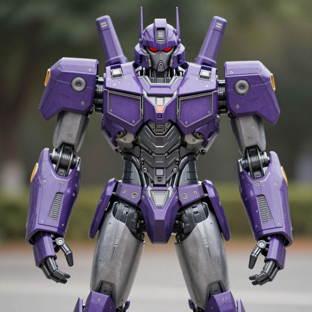 Detailed cosplay costume of Blitzwing G1 mech featuring purple and gray armor with red visor and robotic limbs. The suit exhibits intricate paneling and mechanical joints, capturing the essence of a futuristic robot design. The image is set outdoors with a blurred natural background, emphasizing the costume's vibrant colors and craftsmanship.